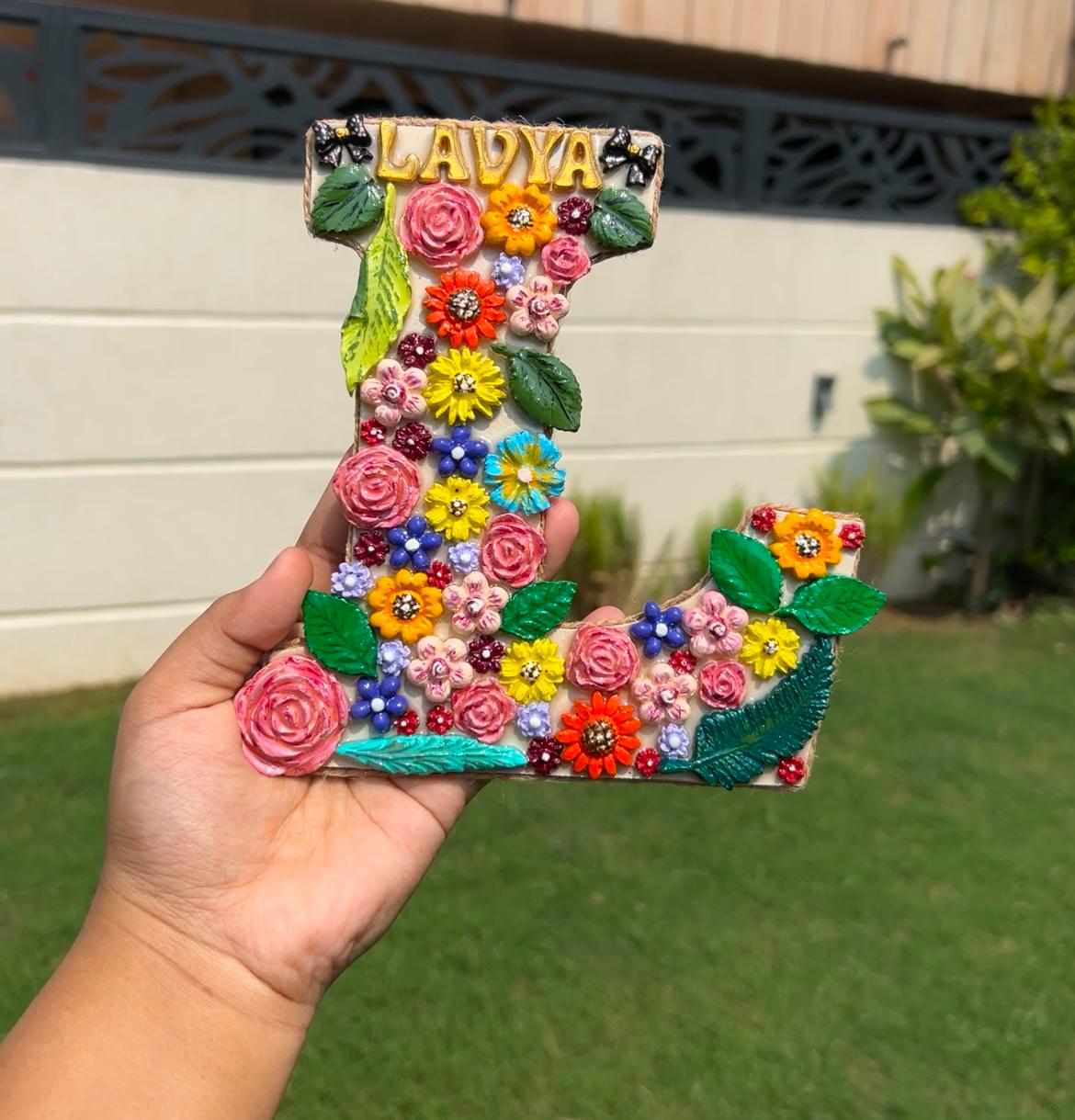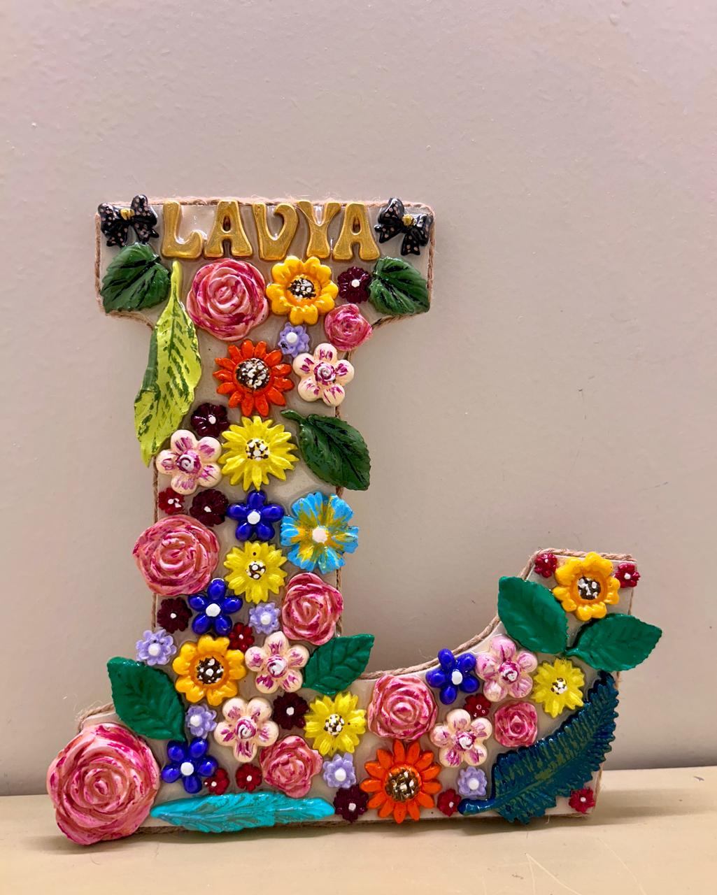 Resin letter L with clay flowers, leaves, butterflies, gold name, intricate textures, handcrafted finish, near A4 size, decorative art piece.